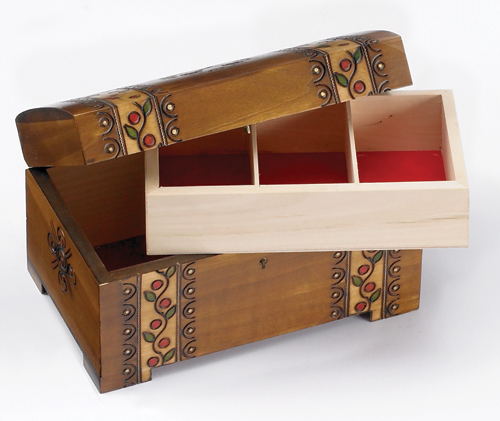 Chest style box with banded vine and floral pattern accented with metal inlays. A three compartment tray lifts out to reveal the bottom compartment of the box. Lock and key.