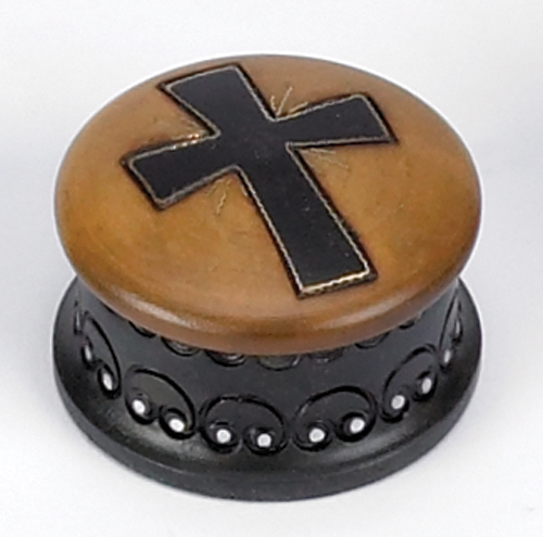 Round box with carved cross and metal inlay accents on lid. Carved pattern around base accented with silver paint.