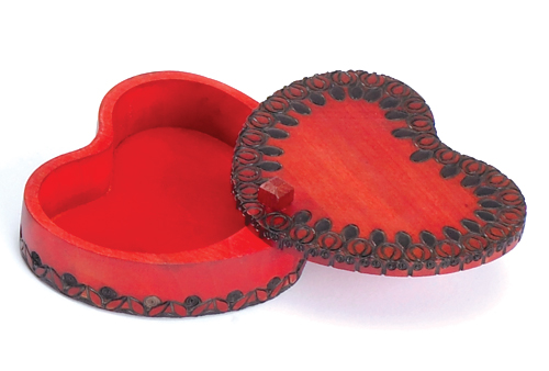 This vibrant heart shaped box has a carved border design and a lid that swivels open to access the box compartment.