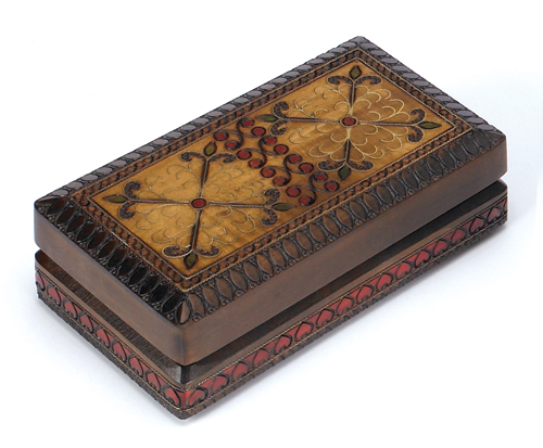 This box is decorated with a dual floral design created and accented with metal inlay.