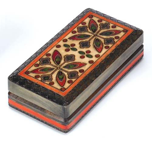This box is decorated with a dual geometric/floral design and is accented with metal inlay.