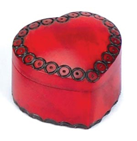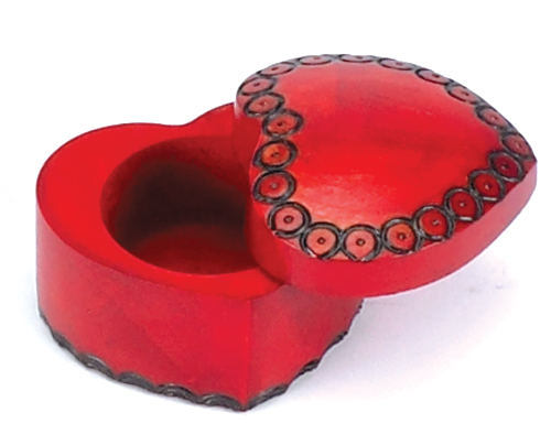 This vibrant heart shaped box has a carved border design and a lid that swivels open to access the box compartment.