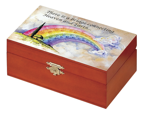 This lovely box features artwork created by renown artist Nora Wildgren and was inspired by the very moving and popular poem Rainbow Bridge. Each box is decorated and stained by hand and is accompanied by an insert with the artist's print on one side and the text of the poem on the other. Three sizes are available: 7330, 7331, and 7332.