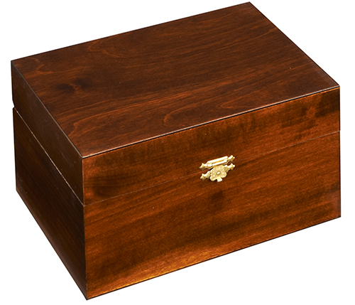 A simple walnut-finish box with gold colored closure. Elegant in its simplicity.