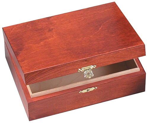 Simple, classic, rectangular shape with maple finish. A brass clasp secures the closed lid.