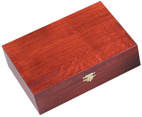 Simple, classic, rectangular shape with maple finish. A brass clasp secures the closed lid.