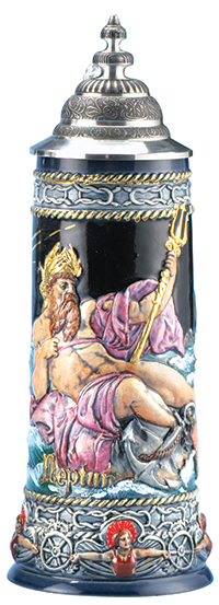 Stoneware, raised-relief decoration. This stein features the Roman god of the sea, Neptune, resting on a raging sea. To the left waves crash against the base of a lighthouse and to the right a ship braves the stormy seas. The entire stein is skillfully hand-painted with color and gold leaf accents. Rope and nots border the top and bottom of the stein along with various nautical themed items. A mermaid figurehead forms the handle of the stein and a conical pewter lid completes the piece. Limited edition of 5,000 pieces worldwide.