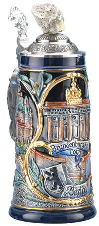 Stoneware, raised-relief decoration. This stein is has a cobalt blue background and is accented with gold-leaf borders around the main subject panels. Wonderfully detailed emphasizing the Brandenburg Gate of Berlin and the Berlin Coat of Arms opposite the handle. Other famous Berlin landmarks complete the decorations. A piece of the Berlin Wall is attached to the conical pewter lid.