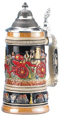 Stoneware, hand-painted raised relief decoration. This stein features a group of firefighters outfitting and preparing their steam power engine for service. The stein is hand-painted with bold colors and gold-leaf accents. An conical antiqued pewter lid completes the piece. Limited edition of 10,000 pieces.