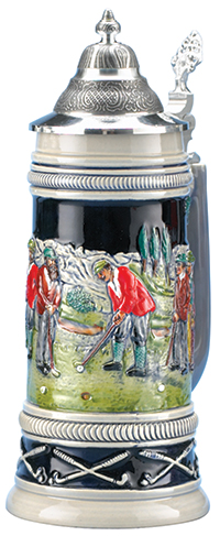 Stoneware, hand painted raised relief decoration. This stein features a group of people enjoying a day of golf against a mountainous backdrop. The design of the stein is hand painted in detailed color against a cobalt blue background. A border of gold clubs encircles the base and a conical antiqued pewter lid completes the piece. Limited edition of 10,000 pieces.