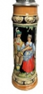 Stoneware accent piece, raised-relief decoration. Assorted Old German designs of a lively group of people toasting life and enjoying each others' company. Pewter conical lid.