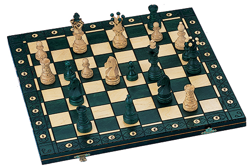 This chess set comes in assorted colors. The board folds in half to form a case to store the hand carved pieces.
