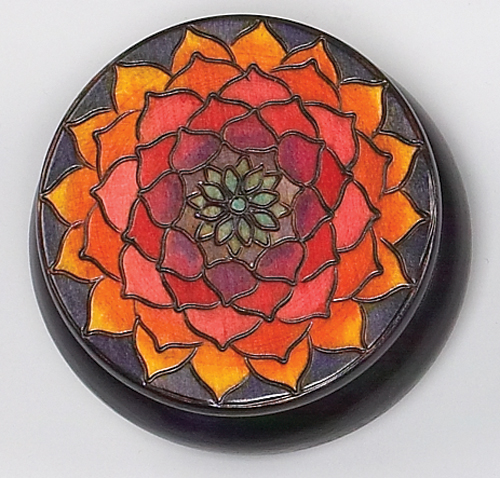 This round box features a Bryon Allen design with a colorful lotus pattern.