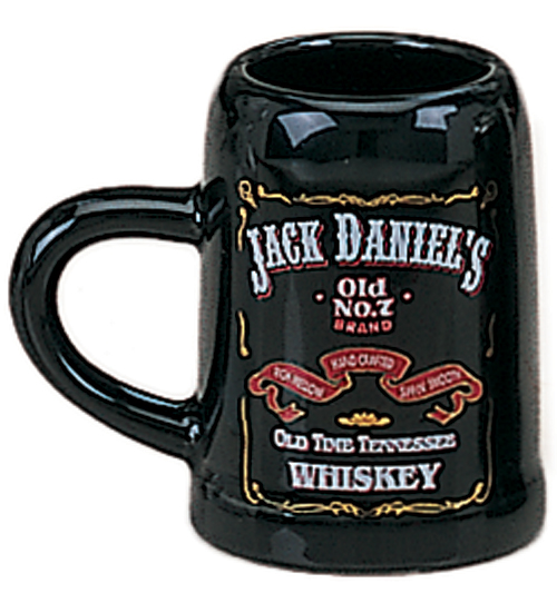 The high grade stoneware body is black glazed throughout. It is decorated with a combination white/red/gold design depicting the Jack Daniel's classic Swing logo design. A red ribbon in the center of the motif creates a dramatic contrast for the design. Identical to item 8303 but without pewter lid. Official Licensed Product.