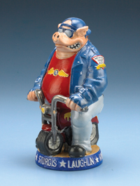 Porcelain biker hog piggy bank. Hog character is full colored and detailed. Bank base is ringed with names of famous rallies: Laconia, Sturgis, Daytona, Laughlin, Myrtle Beach. A great collectible for motorcycle enthusiasts.
