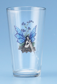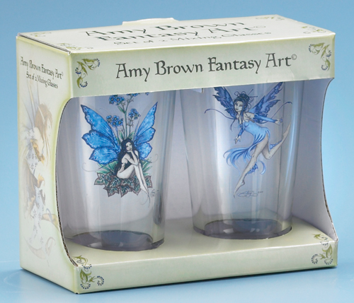 Two of Amy Brown's winged women adorn these pint glasses: a floral sylph seated on soft greenery and a web-legged nereid prancing weightlessly. Officially licensed product.