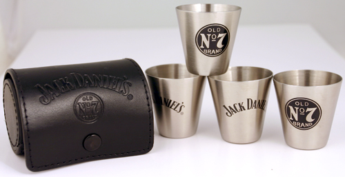 Four stainless steel shot glasses each with the Jack Daniel's Swing Logo on one side and the Old No. 7 button logo on the other, are stacked neatly inside a black leather case with embossed Jack Daniel's Swing logo and Old No. 7 button logo. This light weight, compact item is perfect for travel. Great companion piece to item 8468. Official Licensed Product.