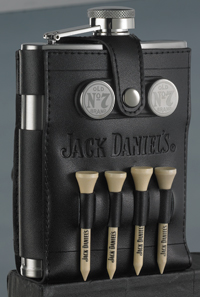 Stainless steel, black cover. This6 ounce flask comes with a removable black cover designed to carry a multitude of handy golf items including markers, tees, and a pitch repair tool. The cover also has a belt loop complete with snap closure for easy transport. All items display either the Jack Daniel's Old No. 7 Button logo or the Jack Daniel's trademark. A captive top completes the piece. Official Licensed Product.