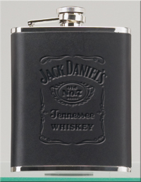 Stainless steel, leather wrapped, polished finish. This group sized flask can hold 18 ounces of your drink of choice. A large Jack Daniel's Label logo decorates the black leather cover. Great companion piece to item 8462. Official Licensed Product.