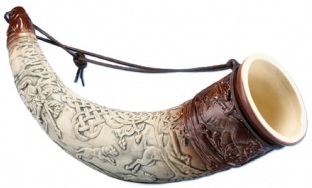 Stoneware, raised-relief decoration. This horn celebrates the greatest of the Irish Myth-heroes, CuChulainn, whose larger-than-life exploits were recorded in the 12th Century Book of the Dun Cow. At the age of six, the boy Setanta killed a fierce watchdog belonging to Cullan the Smith with his bare hands, then offered himself as a replacement. Seeing this, the chieftain Conall christened him CuChulainn, The Hound of Culann. In his final battle, mortally wounded, he lashed himself to a pillar to remain upright & continue fighting. So feared was he that his enemy Lugaire dared approach his body only after a crow had settled on him. This explains the horn's motif: On both sides of the horn, in relief is CuChulainn on horseback with dog, hunting a stag in the woods. The branches & roots of the trees transform into an elaborate knotwork pattern. The mouth of the horn features a faithful dog with sword. The horn tip is a rapture's head. The Horn of CuChulainn was sculpted by Bob Maurus. A strap for carrying/hanging the horn is included.