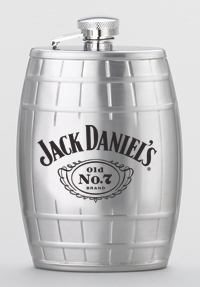 Satin finish. This barrel shaped flask displays the Jack Daniel's Swing logo and Old No. Brand cartouche between the raised barrel bands. The twist off stainless steel captive top is permanently attached to the flask for loss prevention. Official Licensed Product.