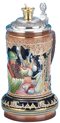 Stoneware, raised-relief decoration. This reproduction of an antique portrays a medieval chemist preparing a potion and recording his results. The phrase on both sides of the scene is translated to read In me is truth, I cannot lie, one drinks no poison from a stein such as this. The stein has an unusually tapered upper body and flared base. Special emerald/cobalt multicolor hand-painted decoration, with twelve different subject colors, antique glazed finish, and gold-leaf accents. A miniature mortar and pestle is mounted on the pewter lid. Limited edition of 10,000 pieces. Each stein is registered and individually numbered. Approximately 2,500 pieces of the 10,000 piece edition limit will be offered in this version.