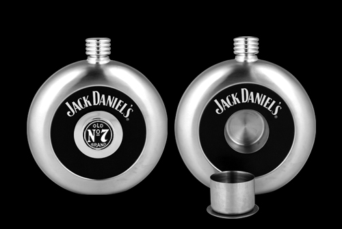 This clever round flask features a stainless steel shot that pops out of the center of the flask. The Jack Daniel's Swing logo and Old No. 7 Bug logo adorn the side of the flask and the bottom of the shot creating a sleek design. Official licensed product.