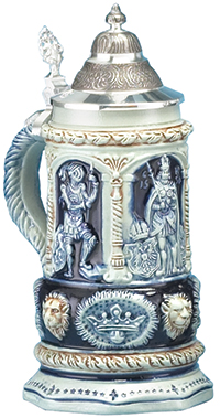 Stoneware, raised-relief, five-panel decoration of King Charlemagne and royal subjects. Flared base with lion heads and crowns. Special three-tone (cobalt, gray, brown) finish. Pewter conical lid. Limited edition of 10,000 pieces.