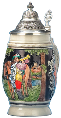 This barrel shaped stein has a colorful design with a trumpeter and his horse playing a call with a castle in the background. A conical pewter lid completes the piece.