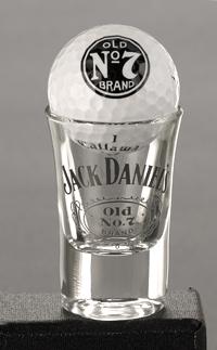 This set includes one golf ball with the Old No. 7 logo on it, and one clear shot glass with the swing and cartouche logos. The shot stands 2-3/4 inches high and holds 1 oz. Both pieces are officially licensed products.