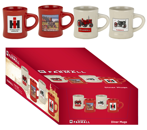 This display is great way to easily and attractively market your IH diner mugs! The top of the full-color IH case folds back to instantly create the display and showcase the set of nine assorted mugs inside. The mug set includes six each of item 6837 (red mug with IH logo) and three each of item 6833 (white mug with vintage Farmall tractor logo). The mugs are crafted from high-quality stoneware and each hold 8 oz. This is an officially licensed product.