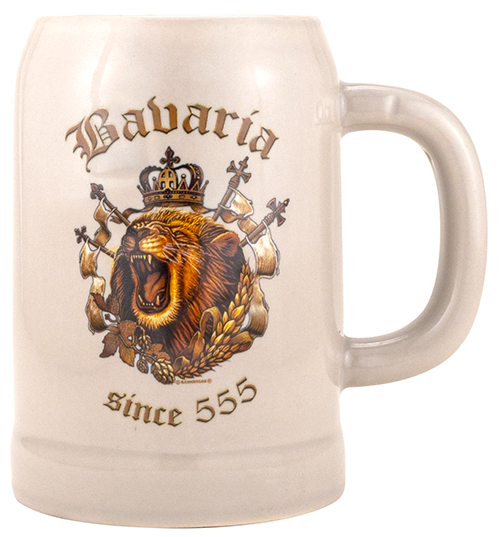 This traditional kannenbaecker-style mug is decorated with a handsome roaring lion decal and reads "Bavaria Since 555." Sturdy mug holds 0.5L.