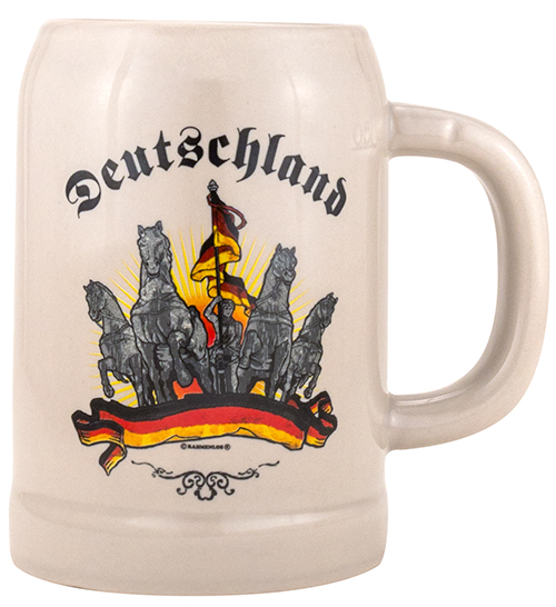 This traditional, stoneware kannenbaecker mug is decorated with horses and a banner in the colors of the German flag. Text across the top reads "Deutschland." This sturdy, handled mug holds 0.5L.