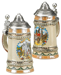 This miniature stoneware stein is available in assorted city scenes. Intricate borders wrap around the stein above and below the city scene. The stein is topped with a conical pewter lid.