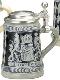 This miniature cobalt stein has the Bayern crest in raised relief, with a banner that reads "Bayern" underneath it. It comes complete with a flat pewter lid.