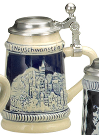 This miniature stoneware stein depicts Neuschwanstein castle in raised relief, in cobalt and ivory. It is topped with a flat pewter lid.