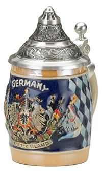This miniature stoneware stein has the German crest, in raised relief, opposite the handle. It reads "Germany" above it, and "Deutschland" below. It is topped with an ornate conical pewter lid.
