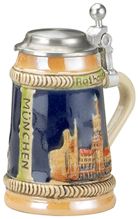 This miniature stoneware stein depicts Munchen in raised relief, painted in full color. It is topped with a flat pewter lid.