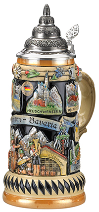 This .75L stein features scenes and icons of Bavaria, including: Oktoberfest beer hall and band, and Neuschwanstein castle. Top band of stein has raised-relief edelweiss, beer stein, Bavarian hat and more. Bottom band features the Bavarian flag diamond pattern.