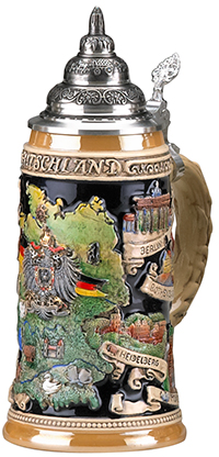 A relief map shows the changing topography of Germany; from the coastal lowlands to the mighty Alps. German eagle and flag are embedded into the map, while raised-relief details of large cities like Berlin, Heidelberg and others complete the design on either side of the map.