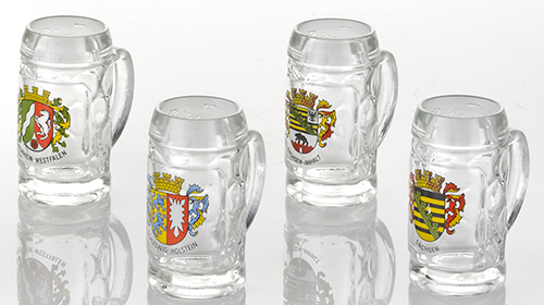 Assorted miniature Isar glasses, sold in multiples of 6 assorted. Features color German state crests.