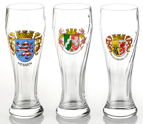Half-liter glass spiral pilsners decorated with German state crests. Sold in multiples of 6 assorted.