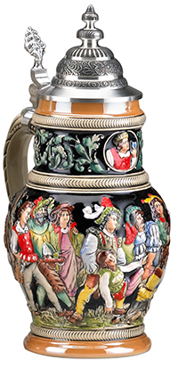 A full-color, raised relief theater scene plays out on this handsome, traditional stoneware stein. An ornamental pewter lid completes the item. Made in Germany.