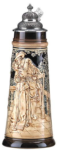 This large, traditional stein features a hunter embracing a woman for a kiss. It is finished in the classic "antique" stein colors. The raised relief stoneware stein is 18" high, holds 2.0 liters, and is completed by an ornamental pewter lid.