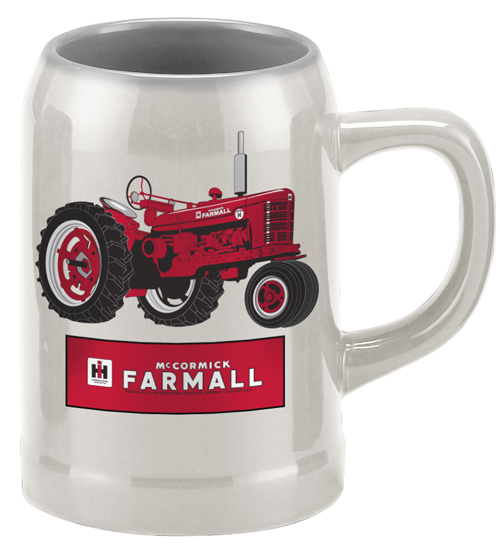 High grade stoneware body with an individually hand-formed handle and rich white glaze. Farmall tractor and logo featured.