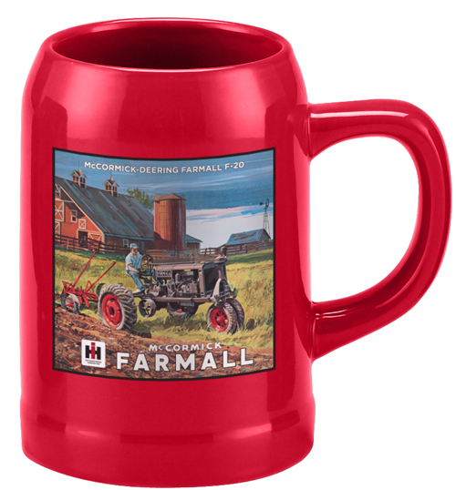 High grade stoneware body with an individually hand-formed handle and rich red glaze. Vintage farm scene and Farmall F-20 tractor featured.