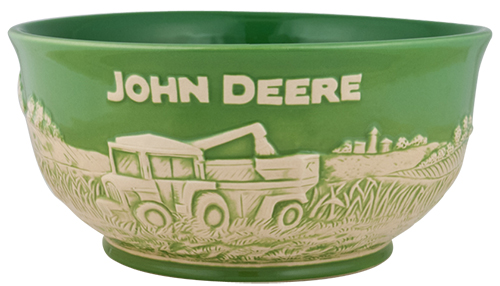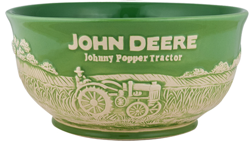 Stoneware bowl with rich glaze, featuring a raised-relief decoration which wraps around the entire bowl. Vintage scene on one side with "Johnny Popper Tractor", modern scene with contemporary logo on the other.