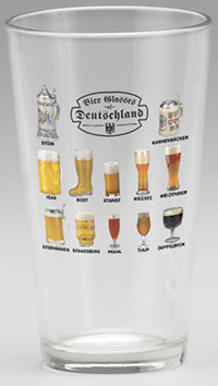 Do you know the difference between a strassburg, an isar, or a kannenbaecker? Grab this useful pint glass to learn the various styles of Deutschland beer vessels! This 16 oz. pint glass features a permanently fired decal displaying 12 popular German beer steins and glasses headed by the words "Bier Glasses of Deutschland."