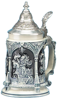 Four knights on horseback appear on body and are framed by pillars, arches and steeples. Rams head handle. Made by Thewalt, Germany. Gray and cobalt blue color combination. Conical pewter lid. Limited edition of 10,000 pieces. Each piece registered and individually numbered. 2,500 pieces will be produced in this version.