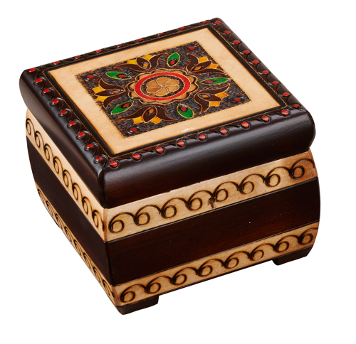This two-toned chest box is decorated with swirling designs along the sides and includes a lock and key. The lid features a bright, circular floral motif. Handmade in the Tatra Mountain region of Poland.